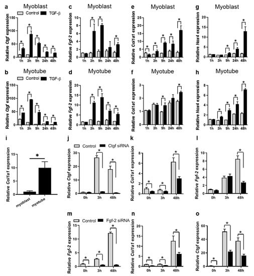 TGF-β affects fibrotic gene expression levels in myoblasts and myotubes in a time-dependent matter. (a–h) mRNA expression levels of (a) Ctgf in myoblasts, (b) Ctgf in myotubes, (c) Fgf-2 in myoblasts, (d) Fgf-2 in myotubes, (e) Col1a1 in myoblasts, (f) Col1a1 in myotubes, (g) Nox4 in myoblasts, (h) Nox4 in myotubes. (a–d) In myoblasts and myotubes, expression levels of Ctgf and Fgf-2 were acutely induced by TGF-β. (e–h) Col1a1 and Nox4 expression levels were gradually induced by TGF-β. Gapdh served as housekeeping gene; data were normalized to values of control cells at 0 h; * indicates significant difference at p < 0.05; n = 3 experiments per condition (a–h). (i) Col1a1 mRNA expression levels in myotubes were approximately 10-fold higher compared to those in myoblasts. Gapdh served as housekeeping gene; data were normalized to expression values in myoblasts. * p indicates significant difference at <0.05; n = 6 experiments per condition. (j) At all time points after siRNA treatment, Ctgf expression was knocked down by >90%. (k) Col1a1 expression was reduced in the presence of siRNA targeting Ctgf. (l) After 3 h of TGF-β treatment, Fgf-2 expression increased independent of Ctgf. After 48 h of TGF-β treatment, in the presence of siRNA targeting Ctgf, Fgf-2 expression was significantly reduced. m At all time points after siRNA treatment, Fgf-2 expression was knocked down by >81%. Both Col1a1 (n) and Ctgf (o) expression levels were significantly reduced in the presence of siRNA targeting Fgf-2 compared to those of control siRNA condition. Gapdh served as housekeeping gene; data were normalized to values of control cells at 0 h; * indicates significant difference at p < 0.05; n = 6 experiments per condition (j–o).