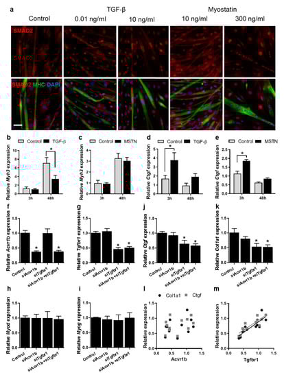 Due to the functional and mechanistic similarities between TGF-β and myostatin, the effects of myostatin and TGF-β on C2C12 and primary myoblasts were studied. C2C12 and primary myoblasts, as well as myotubes, were treated with different doses of myostatin or TGF-β. Although a higher concentration of myostatin was needed compared to that of TGF-β in C2C12 and primary myoblasts, as well as myotubes, both proteins induced the translocation of SMAD2 to the nucleus. Figure 5a shows that in primary myotubes and undifferentiated myoblasts, 1 h of 10 ng/mL TGF-β or 300 ng/mL myostatin treatment resulted in the nuclear translocation of SMAD2. Little effect was observed for 0.01 ng/mL TGF-β or 10 ng/mL myostatin. Both of these ligands have a molecular weight of 25 kDa. In primary myoblasts, the comparison of effects of 3 and 48 h myostatin or TGF-β treatment on myogenic and fibrotic gene expression levels showed that after 48 h TGF-β reduced Myh3 expression by approximately twofold compared to controls, while myostatin did not affect Myh3 expression (Figure 5b,c). Furthermore, although in primary myoblasts after 3 h of treatment both myostatin and TGF-β significantly enhanced Ctgf mRNA expression levels, TGF-β increased Ctgf expression levels by 2.2-fold, while myostatin increased Ctgf expression levels only by 1.6-fold (Figure 5d,e). These results indicate that TGF-β has a stronger effect on fibrotic and myogenic gene expression levels than myostatin.