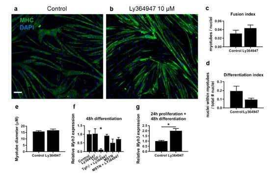 Effects of type I receptor blocking on myoblast differentiation is time-dependent. (a,b) C2C12 cells were induced to differentiate in control medium (a) or in medium supplemented with the TGF-β receptor inhibitor Ly364947 (b). Myotubes were stained for MHC (green) and nuclei were stained using DAPI (blue). Scale indicates 100 µm. (c) Fusion index, defined as number of myotubes ≥ 2 nuclei/total number of nuclei and (d) differentiation index defined as number of nuclei within MHC+ myotubes/total number of nuclei were not significantly affected by Ly364947 treatment. Error bars indicate standard error of the mean; * indicates significant difference at p < 0.05; n = 4 experiments per condition. (e) Myotube thickness was not affected by Ly36447 treatment, compared to control condition. (f) 48 h of Ly364947 treatment did not affect Myh3 expression levels in differentiating C2C12 myoblasts. Myh3 expression levels were significantly increased in cells simultaneously treated with TGF-β and Ly364947 compared to those of cells treated with TGF-β and similar to those of untreated cells. Myostatin did not significantly affect Myh3 expression levels. (g) Myh3 expression levels were significantly increased when C2C12 myoblasts were treated with Ly364947 during proliferation for 24 h and subsequent culture in differentiation medium for 48 h.