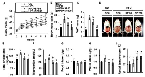 To evaluate the anti-obesity effects of SP in vivo, we used an HFD-induced obese ICR mouse model. After 6 weeks, the body mass of control HFD-fed mice was significantly higher than that of CD-fed mice, but was reduced by SP administration in a dose-dependent manner (Figure 1A,B). The body mass gain of HFD-fed mice was 23.9 ± 1.7 g, but that of the SP50 and SP200 groups was 19.3 ± 3.9 g and 13.5 ± 3.8 g, respectively. The mean VAT mass was effectively reduced by 16.4% and 49.7% by SP administration at 50 and 200 mg/kg/day, respectively (Figure 1C). Additionally, SAT mass was significantly reduced by SP treatment in a dose-dependent fashion. By contrast, there were no differences in the masses of BAT, liver, lung, spleen, or kidney among the groups (Table 1). Representative images of mice from each group are shown as Figure 1D. Visceral obesity is known to be associated with high serum cholesterol and triglyceride concentrations []. As shown in Figure 1E–F, the serum total cholesterol concentration was 134.0 ± 4.5 mg/dL in the HFD group, but only 117.5 ± 6.8 mg/dL and 113.3 ± 3.9 mg/dL in the SP50 and SP200 groups, respectively. Likewise, the triglyceride concentration in the HFD group was 115.3 ± 5.2 mg/dL, and that of the SP50 and SP200 groups was 101.5 ± 6.6 mg/dL and 97.3 ± 7.5 mg/dL, respectively. There were no differences in food and water intake among the groups, suggesting that the inhibition of body mass gain in SP-treated mice was not due to a lower food intake. Lastly, to investigate the effect of SP on energy expenditure, the rectal temperature of the mice was measured at the end of the administration period. As a result, SP significantly increased the body temperature to 38.0 ± 0.4 and 38.0 ± 0.3 °C at 50 and 200 of the SP-treated group, respectively. Furthermore, Table 2 indicates that SP displays no significant differences in serum creatine or AST and ALT concentrations, which are markers of renal injury or indicative of liver damage, respectively. Therefore, SP treatment does not affect hyperthermia by systemic inflammation associated with acute kidney or liver injury.