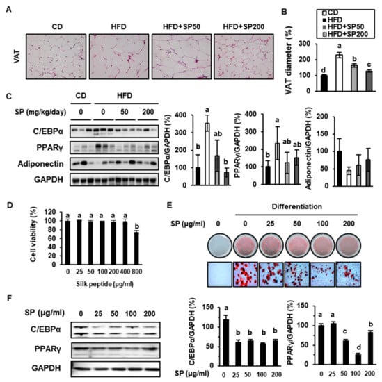 Effect of silk peptide on lipid accumulation in visceral adipose tissue from high-fat diet-fed mice and 3T3-L1 cells. (A) Hematoxylin and eosin staining of VAT from mice treated for 6 weeks. (B) Mean diameter of VAT cells (arbitrary units). (C) The expression of adipogenic factors in VAT was measured by western blotting. (D) Viability of 3T3-L1 pre-adipocytes treated with SP for 24 h. (E) Oil red O was used to stain cells after 10 days of differentiation in the presence or absence of SP, and photomicrographs were obtained (400× magnification). (F) Expression levels of proteins involved in adipogenesis in 3T3-L1s. Data are the mean ± SD of six replicates and were analyzed using one-way ANOVA and Duncan’s test. Values with different letters are significantly different; p < 0.05 (a > b > c > d).