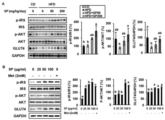 Skeletal muscle is one of the main tissue regulators of glucose metabolism, which makes normal muscle metabolism important for whole-body glucose homeostasis. In particular, a substantial increment in muscle glucose uptake results from the translocation of GLUT4 to the sarcolemma in response to insulin []. However, in addition, AMP-activated protein kinase (AMPK), an energy sensor that is important in metabolic homeostasis, also stimulates glucose uptake and mitochondrial biogenesis, and has been shown to ameliorate insulin resistance in this way []. In the present study, HFD-fed mice showed 28.4% lower AMPK phosphorylation in skeletal muscle than CD-fed mice, but SP treatment normalized this. In addition, p-IRS expression was higher in the SP-administered groups than in CD- and HFD-fed mice (Figure 5A). In skeletal muscle, GLUT4 expression was significantly lower in HFD-induced obese mice. However, SP50 and SP200 treatment markedly increased GLUT4 expression.