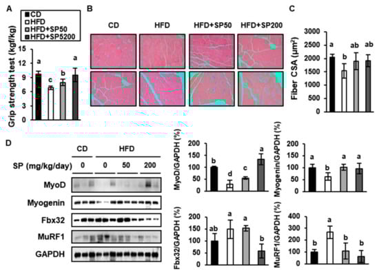 Muscle comprises >40% of the body mass, and the maintenance of skeletal muscle mass and strength is considered essential for maximizing the life span []. Interestingly, when the grip strength was measured to assess the muscle exercise capacity, it was found to be 29.9% lower in HFD-fed mice than in CD-fed mice, but this defect was ameliorated in SP-administered HFD-fed groups (Figure 6A). In addition, H&E-stained images of gastrocnemius muscle in the hindlimb (Figure 6B,C) established that SP treatment dose-dependently increased the cross-sectional area (CSA), which implies that SP has an effect on the size of muscle fibers.