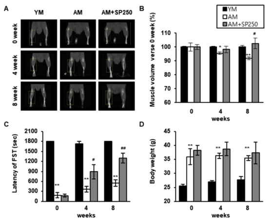 A reduction in muscle mass and an increase in body weight are some of the most striking changes associated with advancing age. These changes can have metabolic dysfunctional consequences in the body []. In this study, we investigated the effect of SP on aging-induced sarcopenia end exercise using the 6-week-old and 12-month-old aged mice. As shown in Figure 7A,B, the total hindlimb muscle of the AM group was significantly reduced during 8 weeks compared with that of YM. However, the muscle volume of 250 mg/kg/day SP administrated AM (AM + SP250) was effectively increased for 8 weeks. In addition, FST data shows that the exercise time was longer with SP treatment in AM, which implies that SP enhances the muscle strength by increasing the muscle mass (Figure 7C). However, the body weight of AM + SP250 was not significantly different from that of the AM group, but slightly decreased (Figure 7D).
