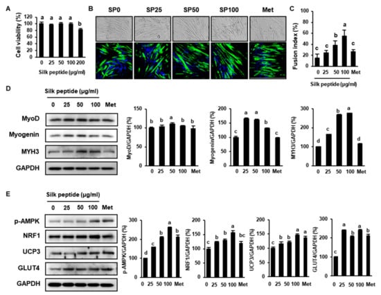 Effect of silk peptide on myoblast differentiation and glucose uptake in C2C12 cells. (A) Viability of C2C12 cells treated with SP for 24 h. (B) Images of morphological change of C2C12 were obtained by an optical microscope (up, 200×). Immunofluorescence for the MYH3 expression of C2C12 in the presence or absence of SP (down, 400×). (C) Fusion index was calculated at the end of differentiation by dividing the number of nuclei within multinucleated myofibers by the total number of nuclei. (D) Expression levels of proteins involved in muscle differentiation (MyoD, Myogenin, and MYH3) were determined using western blotting. (E) Expression levels of mitochondrial proteins and proteins involved in glucose uptake (p-AMPK, PGC1α, UCP3, and GLUT4) analyzed by western blotting. The data were analyzed using one-way ANOVA and Duncan’s test. Values with different letters are significantly different; p < 0.05 (a > b > c > d). Met; 2 mM metformin.