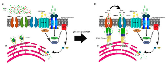 In addition to TRP channels, the SOCE mechanism of action is dependent on the depletion of the endoplasmic reticulum (ER) Ca2+ stores through ryanodine receptors (RyRs) or inositol 1,4,5-trisphosphate receptors (IP3R) [13,14]. SOCE is regulated by agonist binding surface receptors, including G-protein coupled receptors (GPCRs) or receptor tyrosine-kinases (RTKs), activating phospholipase Cβ (PLCβ) via Gq/11 and PLCγ via RTK-mediated signaling [2,6]. This results in the enzymatic cleavage of plasma-membrane phosphatidylinositol 4,5-bisphosphate (PIP2) into IP3 and diacylglycerol (DAG). The depletion of Ca2+ stores from the ER is sensed by the transmembrane protein stromal interaction molecules (STIM1 and STIM2), as Ca2+ dissociates from the EF domain of STIM1 and/or STIM2 [15]. STIM molecules multimerize and translocate to ER–PM junction to form puncta that co-assemble with any or all of three calcium-release-activated calcium (CRAC) channel subunits ORAI1/2/3. This protein–protein interaction between STIM and ORAI results in the sustained opening of the highly Ca2+-selective CRAC channels that allow for both cytosolic Ca2+ signaling and replenishing of ER stores [6]. Additionally, in some cell types, STIM1 may intersect with ORAI1 and members of the TRPC subfamily by its reported capability to directly interact with TRPC1, TRPC4, and TRPC5, and indirectly with TRPC3 and TRPC6 (Figure 1A) [16,17,18,19].