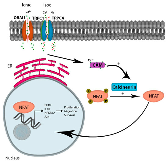 Considering the numerous pathways that Ca2+ signaling modulates, including kinases, phosphatases, proteases, and metabolic enzymes, the role of Ca2+ signaling in the progression of cancer is likely multi-factorial. However, one attractive Ca2+-dependent candidate pathway is the activation of NFAT (reviewed by Putney [35]). Increased intracellular Ca2+ levels occur via multiple channels, but the increased oscillatory Ca2+ currents through emptying of intracellular stores, and extracellular Ca2+ flux through the SOCE is the major contributor to Ca2+ -regulated gene expressions [36]. Ca2+ binding to its receptor calmodulin activates the phosphatase protein calcineurin, which in turn dephosphorylates NFAT, leading to its translocation to the nucleus. NFAT is a transcription factor known to regulate the expression of genes encoding cytokines and receptors mandatory for T-cell survival. Multiple reports indicate that tumor cells have hijacked the calcium-dependent NFAT pathway to support cytokine-dependent survival and homing. For example, in diffuse large B-cell lymphoma (DLCBCL), Bucher et al. reported that NFAT activity is chronically elevated in tumor cells; a finding that correlated with elevated Ca2+ levels. In addition, inhibition of calcineurin with cyclosporin A or FK506 treatment reduced NFAT target genes including EGR2, IL10, NFKB1A, and Jun, and induced cell death in DLCBCL cell lines [37]. Similarly, Urso et al. showed that NFATc3 is a critical determinant of proliferation and migration of U251 glioblastoma cell lines [38]. The authors demonstrated that reducing the expression of NFAT3c inhibited the expression of TNF-alpha, GM-CSF, IL-2, and CXCR-3 when U251 cells were treated with an ionophore. Finally, the authors demonstrated that a reduction of NFAT3c inhibited the growth of U251 cells in vivo. The role of NFAT in cancer progression has been comprehensively reviewed by Mancini et al., where they reported that NFAT overexpression in solid and hematological tumors plays a role in tumor survival, migration, and invasion [39] (Figure 2).