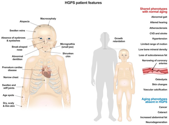 - Gordon, L.B.; McCarten, K.M.; Giobbie-Hurder, A.; Machan, J.T.; Campbell, S.E.; Berns, S.D.; Kieran, M.W. Disease progression in hutchinson-gilford progeria syndrome: Impact on growth and development. Pediatrics 2007, 120, 824–833. [Google Scholar] [CrossRef] [PubMed]