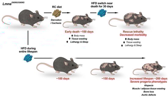 - Kreienkamp, R.; Billon, C.; Bedia-Diaz, G.; Albert, C.J.; Toth, Z.; Butler, A.A.; McBride-Gagyi, S.; Ford, D.A.; Baldan, A.; Burris, T.P.; et al. Doubled lifespan and patient-like pathologies in progeria mice fed high-fat diet. Aging Cell 2018, e12852. [Google Scholar] [CrossRef]