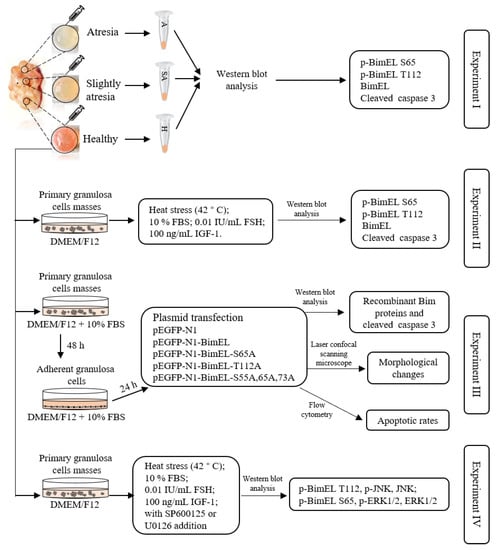 Figure 1 outlines the whole design of this experiment. Experiment I: Both levels of p-BimEL S65 and p-BimEL T112 in the granulosa cells from healthy, slightly-atretic, and atretic follicles were compared. Experiment II: The effects of proapoptotic factor (heat stress) and prosurvival factors (serum, FSH, and IGF-1) were observed on the levels of p-BimEL S65 and p-BimEL T112. Primary granulosa cell masses were treated with 10% FBS, FSH (0.01 IU/mL), or IGF-1 (100 ng/mL) for 24 h. Heat stress was carried out according to the description in a previous study []. Briefly, the primary granulosa cells masses were incubated at 42 °C in humidified air with 5% CO2 for 12 h. Both levels of p-BimEL S65 and p-BimEL T112 were compared among different treatments. Experiment III: The effects of phosphorylation at Ser65 and Thr112 were observed during apoptosis in porcine granulosa cells. BimEL and BimEL mutation vectors were constructed and transfected into porcine granulosa cells. The levels of recombinant Bim proteins and morphological changes of granulosa cells were compared among the cells transfected by different vectors. The apoptotic rates were examined by flow cytometry. Experiment IV: The potential pathways were suggested to induce the levels of p-BimEL S65 and p-BimEL T112 by the prosurvival or proapoptotic factors.
