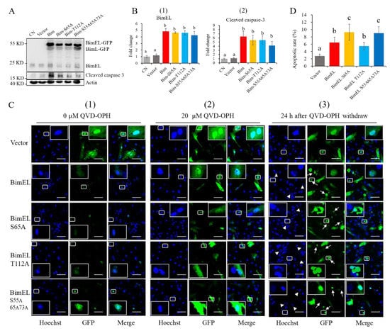 After 24 h of transfection, the green positive cells were seldom found in the groups transfected with BimEL, BimEL-S65A, BimEL-T112A, and BimEL-S55A65A73A plasmids compared to those in the pEGFP-N1 vector. Moreover, the positive cells were almost wrinkled with fragmented or shrunk nuclei (Figure 4C-1). However, the amount of positive green cells increased in BimEL and its mutant groups when the cells were treated with 20 μM QVD-OPH (inhibitor of apoptosis) for 24 h immediately after transfection, and most green cells displayed normal morphologies (Figure 4C-2). After 24 h of QVD-OPH withdrawal, most green cells in BimEL and its mutant groups exhibited apoptosis, including cellular shrinkage, plasma membrane blebbing, and cellular or nuclear fragmentation (Figure 4C-3).