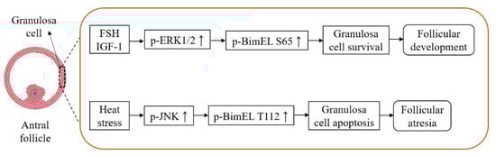 Based on our results, a hypothetical model of BimEL phosphorylation participating in animal follicular atresia is presented in Figure 6. In the antral follicles, survival factors like FSH and IGF-1 promote phosphorylation of BimEL S65 via the ERK pathway inhibiting granulosa cell apoptosis, and, therefore, could prevent follicular atresia. Nevertheless, harmful factors like heat stress or insufficient growth factors will stimulate the phosphorylation of BimEL T112 via the JNK pathway inducing granulosa cell apoptosis, and contribute to follicular atresia. The present results increased our knowledge about the role of BimEL phosphorylation during follicular atresia. Moreover, it may be helpful in improving efficiency of assisted reproductive technologies and treatment of infertility caused by ovarian dysplasia.