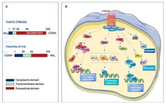 Tumor necrosis factor-like weak inducer of apoptosis (TWEAK)/ fibroblast growth factor-inducible 14 (Fn14) Signaling. (A) Schematic representation of human TWEAK and Fn14 receptor structure showing full-lengths and TWEAK secreted form. (B) Soluble TWEAK binds to the extracellular domain of the Fn14 receptor and produces its trimerization. This structural change of the receptor triggers the recruitment of TRAF proteins to its cytoplasmic tail and the activation of the different pathways; canonical (p50/RelA) and non-canonical (p52/RelB) NF-kB, ERK/JNK/p38 and AP-1, JAK/STAT and PI3K/AKT. Increased activation of these signaling pathways leads to the regulation of specific target genes with their biological mechanistic role.