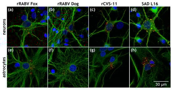 Two-week-old primary rat hippocampal cell cultures were infected with 1 × 103 infectious units of rRABV Dog, rRABV Fox, rCVS-11, and SAD L16, and cultivated for 24 h at 37 °C and 5% CO2. Indirect immunofluorescence was performed by standard techniques after fixation with 4% paraformaldehyde (PFA) in phosphate-buffered saline (PBS) for 30 min and 15 min permeabilization with 0.5% Triton X-100 in PBS. Afterwards, samples were blocked with 0.025% skim milk powder in PBS for 15 min. Immunostainings were executed by 1.5 h incubation with primary antibodies, three wash steps with PBS, followed by 1 h incubation with secondary antibodies and additional Hoechst33342 (1 µg/mL) for staining of the nuclear chromatin. Specimens were mounted on coverslips and were analyzed by confocal laser scanning microscopy.