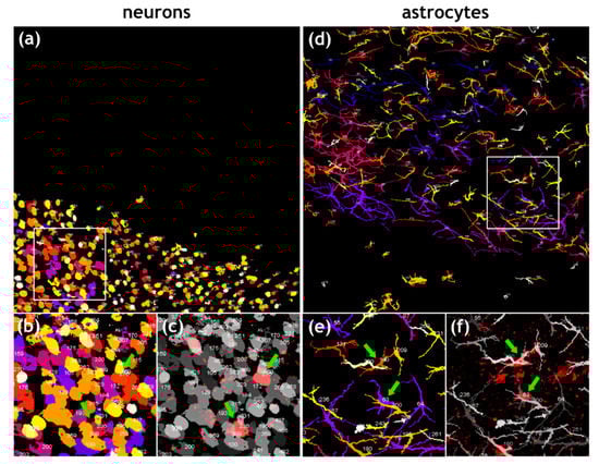 Because of the complex 3D morphology of both neurons (long axons in Figure 2b,c) and astrocytes (filamentous structure of GFAP signals in Figure 2f,g), 3D reconstruction of the imaged tissues (Figure 2d,e,g; Supplementary Videos S1 and S2) was performed in order to achieve reliable visualization and quantification of cells in downstream analyses.