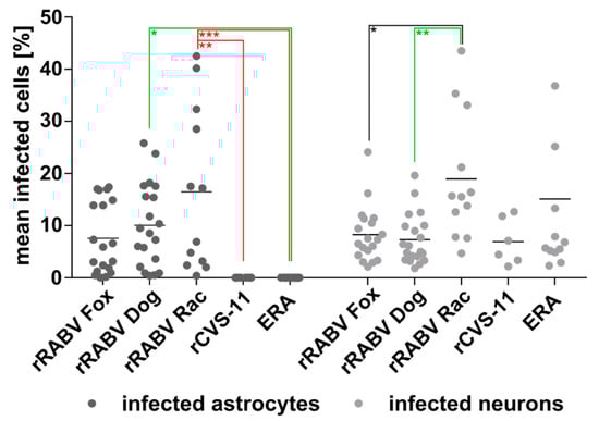 Percentage of field and lab RABV-infected neurons and astrocytes after i.m. inoculation. Per virus, 3 to 9 × 103 astrocytes and 1.5 to 4 × 104 neurons were counted in 19 (rRABV Fox), 20 (rRABV Dog), 12 (rRABV Rac and ERA), and six (rCVS-11) independent confocal z-stacks in three (rRABV Fox and rRABV Dog), two (rRABV RAC and ERA), and one (rCVS-11) animal (see Supplementary Table S1). Each dot represents the frequency of infected astrocytes or neurons in an analyzed z-stack. Mean values are provided as horizontal lines. * p ≤ .05; ** p ≤ .01; *** p ≤. 001 (two-way ANOVA with Tukey’s multiple comparison test).