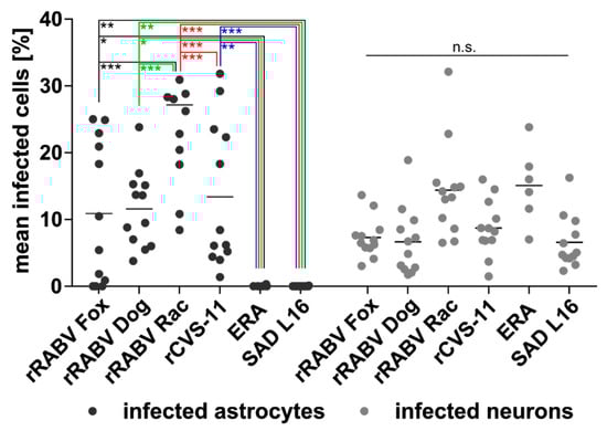 Percentage of field and lab RABV-infected neurons and astrocytes after i.c. inoculation. Per virus, 5 to 9 × 103 astrocytes and 1.3 to 3 × 104 neurons were counted in 12 (rRABV Dog, rRABV Fox, rRABV Rac, rCVS-11, and SAD L16) and six (ERA) independent confocal z-stacks in two (rRABV Fox, rRABV Dog, rRABV Rac, rCVS-11, and SAD L16) and one (ERA) animal (see Supplementary Table S2). Each dot represents the frequency of infected astrocytes or neurons in an analyzed z-stack. Mean values are provided as horizontal lines. * p ≤ .05; ** p ≤. 01; *** p ≤. 001; n.s. = not significant (two-way ANOVA with Tukey’s multiple comparison test).