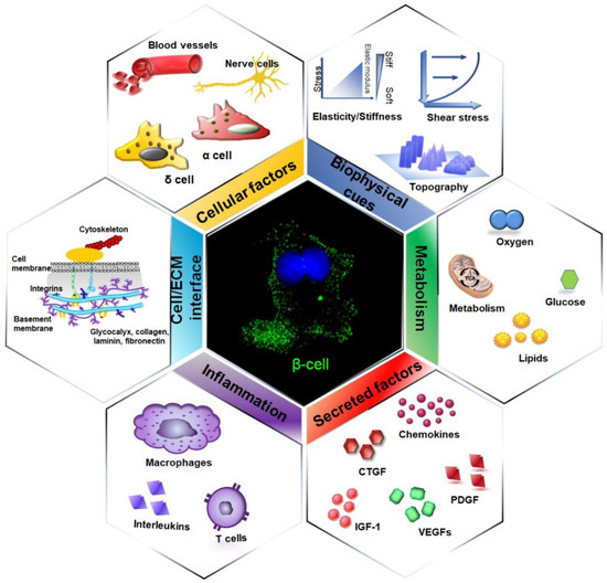 Pancreatic β-cells reside in the islet niche, where they interact with other endocrine cells, vascular endothelial cells, immune and neuronal cells, and the extracellular matrix (ECM). This is a complex and dynamic microenvironment, which presents a myriad of chemical and physical stimuli that is crucial for directing β-cells differentiation (Figure 1).