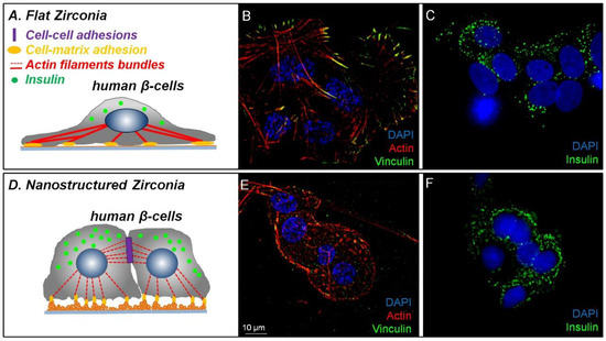 β-cells sense the ECM-mimicking nanotopography and activate a mechanotransduction-dependent program, which promotes their differentiation. Human islets of Langerhans grown on flat (A–C) or nanostructured (D–F) zirconia for 20 days were stained with DAPI (4′,6-diamidino-2-phenylindole) (blue) and for actin (red), and vinculin (green) to visualize the modulation of the mechanotransduction pathway in (B,E); or with DAPI (blue) and insulin (green) to ascertain the β-cell phenotype (C,F). (A–C) Cell–matrix interactions predominate in islet cells grown on flat substrates. β-cells present few insulin granules and are scattered on this substrate. (D–F) Cells grown on the nanotopographical substrates instead adopt a round shape, which favors the establishment of cell–cell contacts and the organization in islet-like clusters where β-cells are full of insulin granules. Note also the different nuclear shapes and sizes of the cells grown on flat or nanostructured substrates [64].