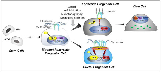 YAP/TAZ play a key role in the mechanotransductively induced stem cell fate decision. Indeed, they are largely expressed and transcriptionally active in the nucleus of hESCs, where they foster survival and prevent differentiation, allowing for their long-term propagation. Their inhibition is instead usually required to promote stem-cell differentiation [128,129,130]. Interestingly, proteins of the Hippo signaling pathway, YAP and its downstream effectors, are present in the pancreatic lineage and YAP expression changes during pancreas development [131,132]. At early stages, YAP is highly expressed and localised mainly in the nucleus of bipotent pancreatic progenitors, where it promotes the expression of PDX1, which is crucial for sustaining their proliferation. Conversely, when differentiation of the endocrine lineages takes place, YAP loses its nuclear localization and its expression gradually decreases due to increased degradation; this favors NGN3 and NKX6.1 expression and fate commitment [131,133] (see also below).
