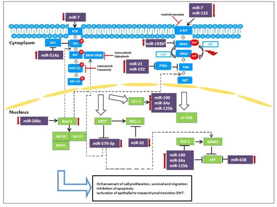 Following the efforts to understand the molecular basis of drug resistance and to establish combination therapies able to revert acquired resistance, studies have focused on miRNAs and their role in controlling and/or reverting drug resistance. In this context, miRNAs act as oncosuppressors. Figure 1 summarizes the involvement of miRNAs in the pathways active in melanoma.