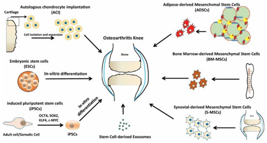 Embryonic stem cells (ESCs) and induced pluripotent stem cells (iPSCs) are pluripotent stem cells that are also employed in cartilage tissue engineering for their chondrogenic differentiation capacity [29,30]. However, ethical concerns, low yield of target cells, and other important limitations deter their use in OA stem cell therapy, even for research purposes. Capable of differentiation to virtually any differentiated cell type, ESCs and iPSCs experience heterogeneous and uncontrolled differentiation. This restricts direct transplantation of ESCs or iPSCs into a focal defect or OA joint for concerns of therapeutic failure and more seriously, tumorgenicity. Indeed, Hwang et al., demonstrated that ESCs expanded in co-culture with chondrocytes resulted in more homogeneous ESC-derived cartilage tissue both in vitro and in vivo [31]. Some studies have generated MSCs derived from ESCs and utilized their exosomes [32] and spheroids [33] in murine and primate OA models. Similarly, exosomes secreted by iPSC-derived MSCs were used in regenerating OA in a rat model [34]. Although ESC- or iPSC-derived MSCs add a level of complexity and sophistication to research, the advantages of using ESC- or iPSC-derived MSCs (as opposed to MSCs) cannot outcompete the disadvantages.