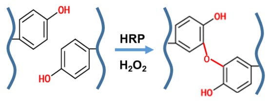 Enzyme-mediated crosslinking. Scheme of enzyme-mediated crosslinking of tyramine residues. Oxidation of tyramine residues enables stable bond formation.