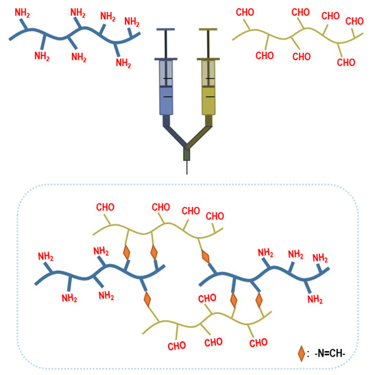 Schiff base crosslinking is achieved by the reaction between an alcohol, amine, or hydrazide group with an aldehyde. The reaction takes place in mild, physiological conditions, eliminating the problem of cytotoxicity of encapsulating cells. Yan et al., fabricated injectable hydrogels from hydrazide-modified poly(l-glutamic acid) and aldehyde-modified alginate [39]. The hydrogel precursor and chondrocyte mix were subcutaneously injected into mice using a double syringe. At 12 weeks in vivo, the Safranin O and Toluidine Blue stainings were deeper in color and more ECM accumulation, demonstrating better cartilage tissue formation compared to cell only injection. In another study, Cao et al., utilized the Schiff base reaction between the amino group of glycol chitosan and the aldehyde group of a PEG analog to encapsulate chondrocytes (Figure 4). Good viability and maintenance of the chondrocyte phenotype were observed after two weeks of in vitro culture [40].