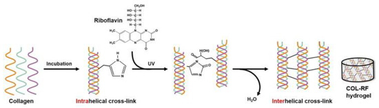 Riboflavin-induced photocrosslinking. Riboflavin acts as a photoinitiator of the reaction between potentially reactive R groups of amino acids in collagen chains such as histidine and tyrosine. Reproduced with permission from Koh, R.H. et al., Acta Biomaterialia; published by Elsevier, 2017.