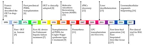Schematic timeline of liver therapy and regeneration approaches and techniques [,,,,,,,,,,,,,]. OLT: orthotopic liver transplantation; PHHs: primary human hepatocytes; AL: artificial liver; iPSCs: induced pluripotent stem cells; LPC: liver progenitor cells; BAL: bio artificial liver.