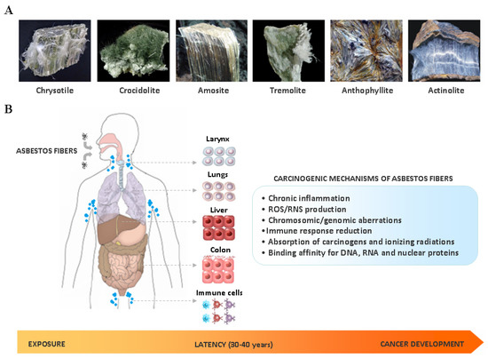 (A) Main types and chemical structure of asbestos fibers: chrysotile, belonging to the serpentine group, and actinolite, amosite, anthophyllite, crocidolite and tremolite, belonging to the amphibole group; (B) Inlated or ingested asbestos fibers may target the cells of different organs, including larynx, lungs, liver, colon and immune system. During the very long latency period of asbestos carcinogensis (30–40 years), cell malignant transformation may occur by a complex interplay among different mechanisms, including: chronic inflammation, reactive oxygen species (ROS)/reactive nitrogen species (RNS) production, induction of chromosomic/genomic aberrations, immune response reduction, absorption of carcinogens and ionizing radiations, and binding to nucleic acids and nuclear proteins.