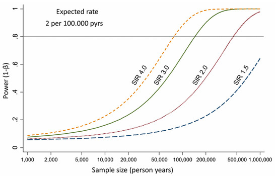 Statistical power for the study of ICC and asbestos exposure calculated under several scenarios according to Armstrong [32]. SIR: standardized incidence ratio.