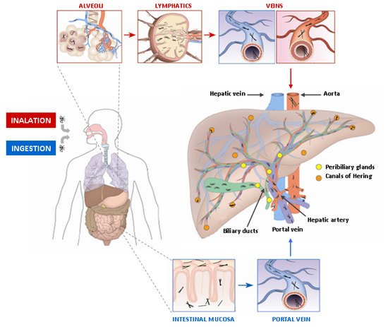 Although further studies on larger cohorts are needed to corroborate these preliminary results, overall these findings provide a proof of evidence that asbestos fibers can reach the biliary tract and the liver. Even if the exact mechanism still remains to be elucidated, the presence of these fibers in the biliary tree within the liver could be explained in the light of their translocation pathway (Figure 3). Asbestos fibers can be introduced into the body by two different mechanisms: inhalation (the most involved) and ingestion. In the inhalation pathway, once inhaled, fibers remain parallel to the airflow direction in the upper respiratory tract and reach pulmonary alveoli. Here, they can be drained by convective flows into pulmonary lymphatics that act as a pump [71]. The clearance of asbestos fibers from lung interstitium through the lymphatic system is a relatively slow phenomenon and, in fact, particles are eventually trapped in the tracheo-bronchial lymph nodes that become “reservoirs of retained material” [71]. Once reached veins through the lymphatic system, asbestos fibers can potentially reach all organs via the circulatory system, including the liver and the biliary tree by the hepatic artery. As to the ingestion pathway, it has been suggested that asbestos fibers can across the intestinal mucosa and be finally delivered to the liver through the portal vein [73].