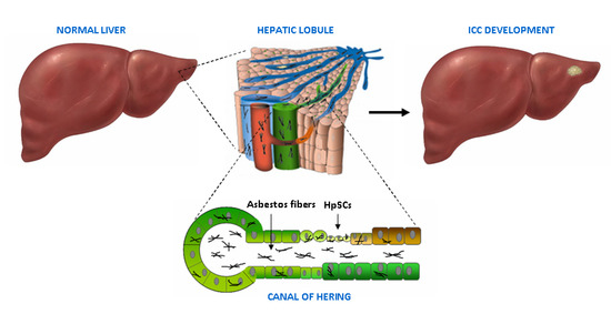 In the liver, asbestos fibers could remain trapped in the smaller bile ducts, particularly at the level of the canals of Hering, where they may exert their carcinogenic effect for a long time, inducing HpSC malignant transformation and finally ICC development.