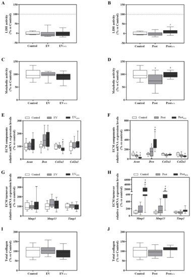 EV, EVw/o, Prot and Protw/o isolates effects on ATDC-5 chondrogenic cell line. (A,B) Lactate dehydrogenase activity was measured from cell culture media of ATDC-5 after 48 h of treatment with EV and EVw/o or Prot and Protw/o. Negative control (0%) was the culture media from cells treated with the vehicle control. Positive control (100%) was the culture media from cells treated with 1% Triton X-100. (C,D) Metabolic activity measured after 48 h of treatment. Data were normalized to the vehicle control group that was set to 100%. (E–H) mRNA expression levels of ECM components genes (Acan, Dcn, Col1a1 and Col2a1) or ECM turnover genes (Mmp3, Mmp13 and Timp1) of ATDC-5 after treatment with EV and EVw/o or Prot and Protw/o for 48 h. Data represent fold changes of target genes, normalized to reference genes (Rn18s and Gapdh) and relative to the group control that was set as 100%. Values presented in box and whisker plots represent the median, minima and maxima of two independent experiments (n = 11) Results in subfigures A,C–E,G and I were statistically compared by ANOVA and Bonferroni as post hoc for cytotoxicity, metabolic activity, Acan mRNA expression levels and total collagen deposition; and by Kruskal–Wallis for Dcn, Col2a1, Mmp3 and Mmp13 mRNA expression levels: * p < 0.05 versus the control; # p < 0.05 versus Prot. Results in subfigures B,D,F,H and J were statistically compared by ANOVA and Bonferroni as post hoc for Acan, Col1a1, Mmp3, Mmp13 and Timp1 mRNA expression levels; and by Kruskal–Wallis for Col2a1 mRNA expression levels: * p < 0.05 versus Control; # p < 0.05 versus EV.