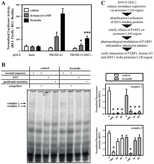 We identified a new, extremely rare single nucleotide variant (SNV) in the aromatase promoter I.3/II-region of a healthy DNA-donor (SNV(T-241C); NC_000015.10:n.51243270T>C; GRCh38.p7 human genome reference; Supplementary Materials, Figure S1). This SNV decreased aromatase promoter I.3/II activity in luciferase-reporter gene assays in 3T3-L1 cells by up to 70%, when the cells were stimulated with the cAMP-elevating agonists di-butyryl-cAMP or forskolin (Figure 1A). This indicates a crucial role for the base-pair at position −241 in relation to the transcriptional start site (TSS) of aromatase promoter II. Two specific protein–oligonucleotide complexes could be identified in soluble nuclear extracts from 3T3-L1 preadipocytes in EMSAs using normal and SNV-containing oligonucleotides, respectively (Figure 1B). Complex formation was independent of forskolin, which induces an increase in cAMP and thereby mimics cancer-related aromatase promoter I.3/II activation. Furthermore, complex 1 was only formed with wild-type oligonucleotide, but not on the SNV-containing oligonucleotide or an extended quadruple mutation thereof. Complex 2 was not affected by the SNV. This indicates that the formation of complex 1 might be necessary for the full induction of aromatase transcription.