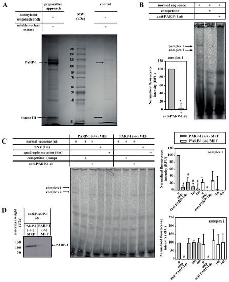 We subsequently identified the DNA-binding protein(s) of the SNV-dependent complex 1. Firstly, DNA-binding proteins from nuclear extracts of 3T3-L1 cells were purified with SNV sequence-containing oligonucleotides coupled to magnetic beads. After SDS-PAGE, a 110 kDa protein was detectable and identified by mass spectrometry as PARP-1 (Figure 2A and Supplementary Materials, Table S2). The formation of complex 1 was blocked by anti-PARP-1 antibody in EMSA with soluble nuclear extracts of 3T3-L1 cells, confirming PARP-1 as a component of complex 1 (Figure 2B). Similar experiments were performed with nuclear extracts from PARP-1 wild-type and knock-out MEFs to confirm this observation (Figure 2C,D). In PARP-1 wild-type MEFs, the formation of complex 1 on wild-type oligonucleotide was inhibited by anti-PARP-1 antibody or when a mutated probe was used, confirming the results from the 3T3-L1 cells described above. Furthermore, PARP-1-containing complex 1 (but not complex 2) was massively reduced in PARP-1 knock-out MEFs.