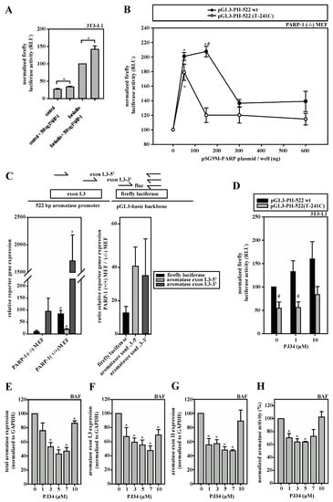 Half-confluent 3T3-L1 preadipocytes or PARP-1 knock-out or wt MEFs in 24-well plates were transfected using Roti-Fect Plus (Carl Roth, Karlsruhe, Germany) according to the manufacturer’s instructions and stimulated 24 h later. To quantify promoter activities, pGL3-basic firefly luciferase plasmid containing aromatase promoter I.3/II with either a normal or SNV sequence were used (Appendix A, Table A3). For PARP-1 overexpression, pSG9M-PARP-1 plasmid was used []. Furthermore, we utilized pRL-SV40 plasmid-expressing Renilla luciferase for normalization. All conditions were tested in triplicate per experiment. The luciferase activity measurement was described by Hampf and Gossen [].