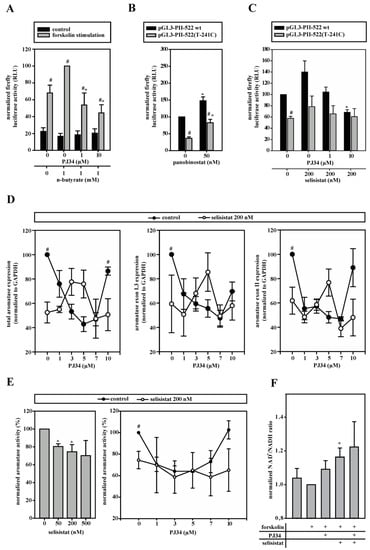 PARP-1 functionally interacts with histone deacetylases (HDACs). If not indicated otherwise, cells were stimulated with forskolin. (A) pGL3-PII-522 wt-transfected 3T3-L1 cells were incubated with n-butyrate, without or with PJ34 (n = 6; * p < 0.05 versus n-butyrate only; # p < 0.05 versus controls). (B) 3T3-L1 cells transfected with pGL3-PII-522 wt or pGL3-PII-522(T-241C) were incubated with panobinostat (n = 8; * p < 0.05 versus no panobinostat; # p < 0.05 wt versus T-241C), or (C) with selisistat alone or in combination with PJ34 (n = 8; * p < 0.05 versus no PJ34; # p < 0.05 wt versus T-241C). (D,E) Aromatase mRNA-expression or activity was measured in BAFs, which were treated with selisistat without or with PARP-1 inhibitor PJ34. For better comparison, the data from BAFs not treated with selisistat (control) were taken from Figure 4E–H (control). SIRT-1 inhibition alone reduced aromatase expression and activity. (D) Control n = 3, selisistat n = 6; # p < 0.05 control versus selisistat; (E) n = 3; * p < 0.05 versus no selisistat; # p < 0.05 control versus selisistat). (F) The increased NAD+/NADH ratios were measured in forskolin-stimulated BAFs with the inhibition of PARP-1 (5 µM PJ34) or/and SIRT-1 (200 nM selisistat) (n = 3; * p < 0.05 versus forskolin alone).