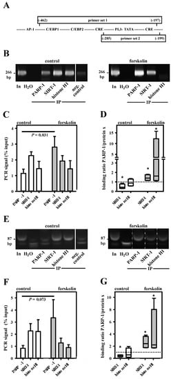 Dynamic interaction of PARP-1, SIRT-1 and histone H1 in the aromatase promoter I.3/II-region. (A) PARP-1, histone H1 and SIRT-1 in vivo binding to the aromatase promoter I.3/II-region in +/− forskolin-stimulated BAFs was analyzed by ChIP with two primer sets. The PCR products were separated on 12% polyacrylamide gels and stained with ethidiumbromide. In, input (1:50 diluted non-immunoprecipitated DNA); IP, immunoprecipitated samples; neg. control (protein G without antibodies). ChIP primer sets 1 ((B–D), 266 bp amplicon) and 2 ((E–G), 87 bp amplicon) revealed similar results (note that the forskolin-group image in E was cut and pasted to show the bands for PARP-1 and SIRT-1 in the general order of this figure; the original sample order is shown in Figure S2; the smaller band is unspecific). Forskolin stimulation increased PARP-1 binding and increased ratios of PARP-1/SIRT-1 and of PARP-1/histone H1 (n = 4; * p < 0.05 versus control).