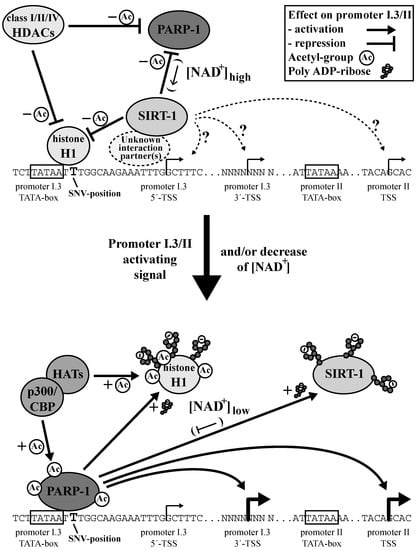 Model of PARP-1-dependent aromatase promoter I.3/II regulation. The aromatase promoter I.3/II-region is predominantly occupied by histone H1 and SIRT-1 (in concert with other HDACs) in un-stimulated BAFs. Signals activating promoter I.3/II trigger p300/CBP- or other histone acetyltransferase (HAT)-mediated acetylation of PARP-1 and H1. The resulting PARP-1 binding and activation boost displacement of H1 and SIRT-1 from the promoter by parylation. SIRT-1 activates promoter I.3/II by an unknown mechanism and, at high NAD+-concentrations, inhibits PARP-1 by deacetylation. Low NAD+-concentrations in tumor-associated BAFs favor PARP-1-activation and perpetuate H1- and SIRT-1-displacement.