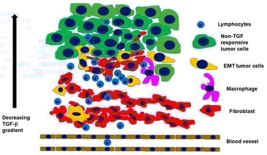 The EMT mediator described by Elisabeth Hay and her colleagues is TGF-β1 [46]. TGF-β1 is regarded as a double-edged sword during tumorigenesis [37], which reflects its ability to be a tumor suppressor in normal tissue and early-stage cancers and also a tumor promoter in progressive cancer [46]. There are higher TGF-β1 concentrations near the tumor vasculature, and the cancer cell nest contains a decreasing TGF-β1 gradient from its border toward the middle. This gradient generates heterogeneity between the tumor–stroma interface and the center of the tumor cell nest [47] (Figure 2).