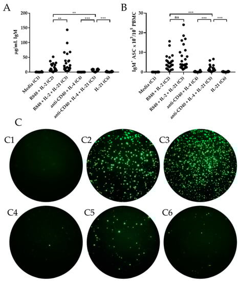 IL-21′s effect on in vitro induction of IgM+ ASC. Healthy human donors (n = 24) were stimulated in vitro under the specified six culture conditions (detailed in Materials and Methods) and the induction of IgM+ ASC evaluated by ELISA (panel A) or ImmunoSpot® (panels B and C). (A) Abundance of IgM in culture supernatants following 11 days of in vitro stimulation. (B) IgM+ ASC were enumerated by ImmunoSpot® following five days of in vitro stimulation. (C) Representative ImmunoSpot® well images, containing 104 live cells per well, from a single donor (Donor 386) following in vitro stimulation. C1–C6 correspond to the stimulation conditions specified on the x-axis of panels A and B. * p < 0.05, ** p < 0.01, and *** p < 0.001.