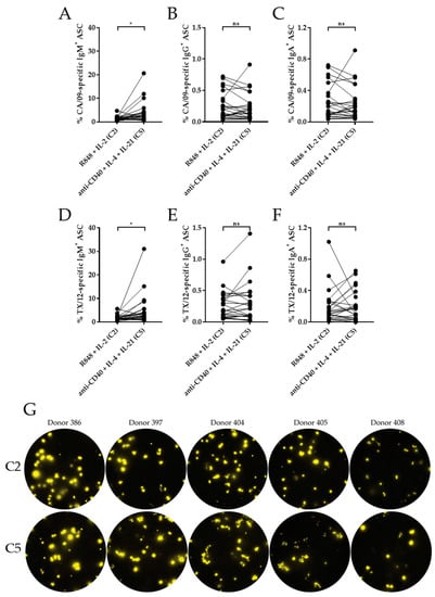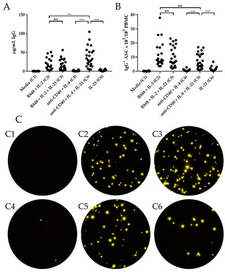 In our protocol, we included IL-4 in addition to anti-CD40 and IL-21. In a systematic study, IL-4 was found to inhibit IgM production triggered by IL-21 in naïve B cells, while CD40 + IL-21 stimulated memory B cells to secrete antibodies irrespective of IL-4′s presence []. This notion is essential for immune monitoring since the latter aims at detecting in vivo primed memory B cells without interference by in vitro primed naïve cells. Therefore, the inhibitory effect of IL-4 on in vitro differentiation of naïve B cells is important because CD40 + IL-21 stimulation triggers proliferative responses by naïve B cells to the same extent as memory B cells [,,]. Furthermore, inhibiting the in vitro activation of naïve B cells through the addition of IL-4 is also important in the context of immune monitoring because IL-21 in conjunction with CD40 stimulation induces class-switching [,].