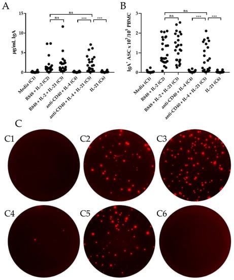 IL-21′s effect on in vitro induction of IgA+ ASC. Healthy human donors (n = 24) were stimulated in vitro under the specified six culture conditions (detailed in Materials and Methods) and induction of IgA+ ASC evaluated by ELISA (panel A) or ImmunoSpot® (panels B and C). (A) Abundance of IgA in culture supernatants following 11 days of in vitro stimulation was assessed by ELISA. (B) IgA+ ASC were enumerated by ImmunoSpot® following five days of in vitro. (C) Representative ImmunoSpot® well images, containing 104 live cells per well, from a single donor (Donor 386) following in vitro stimulation. C1-C6 correspond to the stimulation conditions specified on the x-axis of panels A and B. * p < 0.05, ** p < 0.01, and *** p < 0.001.