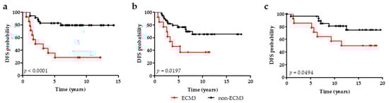 We next evaluated prognosis of patients with ECM3 tumors treated with adjuvant chemotherapy. A total of 44 HER2-positive cases (35 samples 3+ and 9 samples 2+/FISH positive) treated with chemotherapy in our institute before the introduction of trastuzumab in the clinical practice were selected. The Kaplan–Meier curve showed a worse prognosis for patients with ECM3 tumors (p = 0.0494, Figure 2). ECM3 was the variable more associated with DFS and OS both in univariate (Table S1) and multivariate analyses (Table 2 and Table S3), indicating that ECM3 cases have a worse prognosis even if treated with chemotherapy.