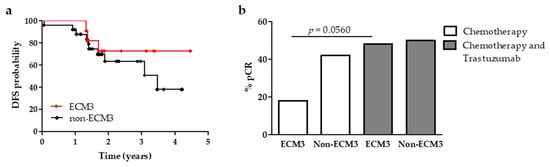 ECM3 predictive significance of trastuzumab benefit. (a) Association between ECM3 (red line) and non-ECM3 (black line) and DFS in HER2-positive BC patients treated with adjuvant trastuzumab-based therapy (GHEA cohort, n = 36). (b) Percentage of pathological complete response (pCR) in ECM3 and non-ECM3 cases according to neoadjuvant treatment (NOAH dataset). p-value by Fisher exact test.