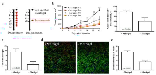 Role of extracellular matrix density in trastuzumab efficacy. (a) Scheme of the in vivo experiments. (b) Tumor volume and percent tumor growth inhibition by trastuzumab at day 42 in tumors obtained from injection of cells with (+ Matrigel) or without (− Matrigel) Matrigel. Data are mean ± SD (n = 4). (c) 131I-Trastuzumab quantification in tumors obtained from injection of cells in mice with (+ Matrigel) or without (− Matrigel) Matrigel 48 h after treatment with 131I-Trastuzumab. Data are mean ± SD of the ratio between radioactivity (count per minute) quantified in the tumor and in the muscle of the same mouse (n = 5). (d) Representative images of trastuzumab localization evaluated by immunofluorescence in tumors of mice injected with cells embedded (+) or not (−) in Matrigel (red: trastuzumab, green: sybr green, nuclei, blue: collagen). (e) Trastuzumab quantification in tumors grown with (+) or without (−) Matrigel 24 h after treatment. Data are mean ± SD (n = 4) of the mean fluorescence intensities of red positive pixels normalized on the number of green pixels (nuclei). p-values by unpaired t-test.