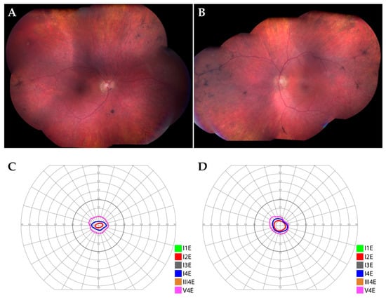 Clinical findings in a patient with retinal degeneration. (A,B): Montage color fundus photographs of the right (A) and left (B) eyes. There was granular, retinal pigment epithelial atrophy in the mid-periphery of both eyes, in addition to peripheral bone-spicule-like pigmentary changes and pigment clumps in both eyes. Arteriolar attenuation was notable in both eyes. (C,D): Goldman visual fields of the right (C) and left (D) eyes. There was severe constriction of the peripheral visual field in both eyes.