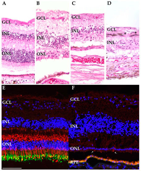 Histological and immunohistochemical investigation of the autoimmune retinopathy (AIR) and control donors. (A–D). Hematoxylin and eosin staining of the AIR and control donors. Sections from the periphery of a control donor (donor 2) (A), the macula (OD) of the AIR donor (B), and the periphery of the AIR donor (C,D). The AIR macula demonstrates intact ganglion cell and inner nuclear layers with attenuated cone photoreceptor outer segments. In contrast, in the periphery of the AIR donor complete loss of the outer nuclear layer (C) and retinal pigment epithelium (RPE) pigment migration into the inner retina (D) is observed (*). (E,F): Cone opsins (blue cone opsin and red/green cone opsins) are labeled in red while RetP1 is labeled in green. (E): A macula from a donor with normal ocular history demonstrates abundant labeling of cone opsins and rhodopsin. Of note, the RPE below the photoreceptors is out of frame. (F) The macula from the AIR donor demonstrates a complete lack of rod photoreceptors with rare, extremely attenuated cone photoreceptors (arrows). Autofluorescent lipofuscin from the RPE appears below the photoreceptor cells. Scalebar (100 microns) for all subpanels is provided in (E).